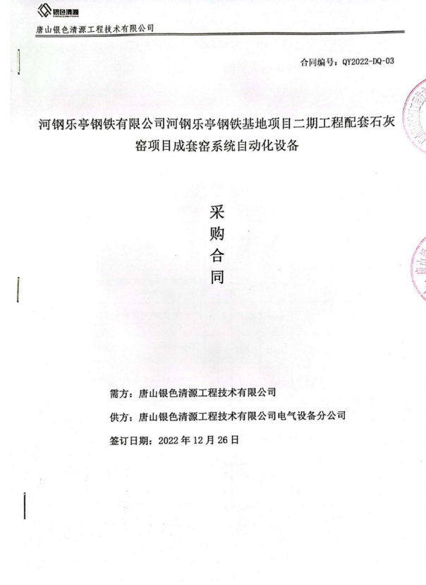 河鋼樂(lè)亭鋼鐵有限公司河鋼樂(lè)亭鋼鐵基地項(xiàng)目二期工程配套石灰窯項(xiàng)目成套窯系統(tǒng)自動(dòng)化設(shè)備采購(gòu)合同