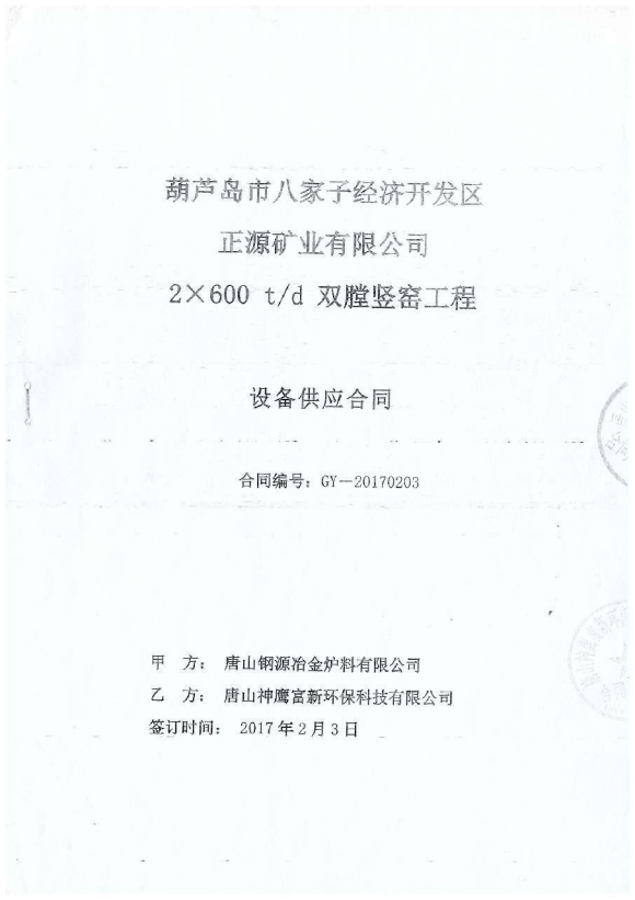 葫蘆島八家子正源礦業(yè)2×600t/d煤粉燃料雙膛豎窯工程,關鍵設備供貨、窯爐安裝指導等