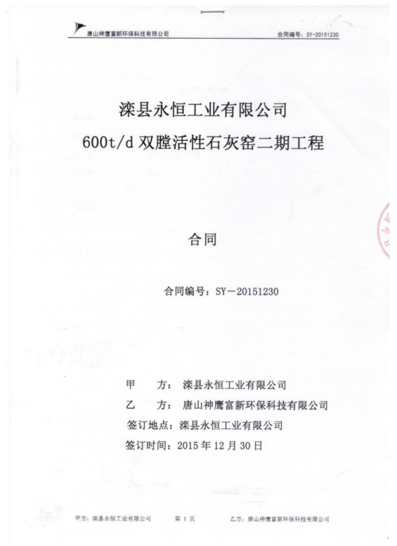 唐山永恒工業(yè)有限公司1x600t/d煤粉燃料雙膛豎窯二期工程,關(guān)鍵設(shè)備供貨窯爐安裝指導等